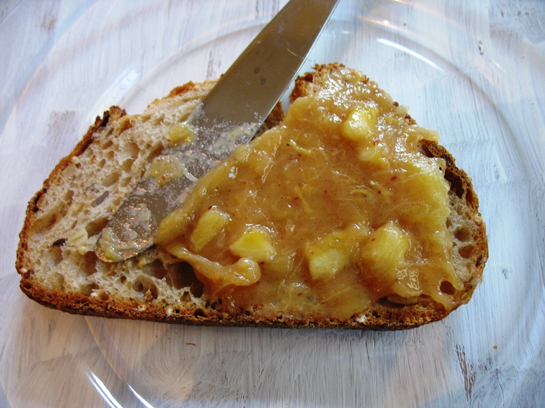 עשיתי כמה שינויים במתכון, בעיקר מכיוון שלא התחשק לי לחשב כמה זה 400 גרם סוכר בכוסות, ומכיוון שהיה לי צנצנת סילאן בארון שרציתי לסיים. בסוף קיבלתי מרקחת בננות וקלמנטינות עם סילאן ווניל. המרקחת מתוקה, אבל לא מתוקה מדי, ובעלת טעם מורכב ומלא. נראה לי שהכנתי בעזרתה את כריך הפינאט באטר אנד ג'לי (הלא הוא ה-PB&J) הטעים בעולם - לחם דגנים מלא ונגיס, ריבה/מרקחת בננתית וסמיכה, ופינאט באטר כמובן.